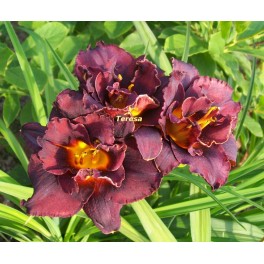 Liliowiec NIght Embers - odmiana dorastająca 0d60-80cm wysokosci .Zakwita w lipcu , kwiat pełny o pieknych ciemnobordowych kwiatch z delikatna falbanka i żółtym środkiem .
